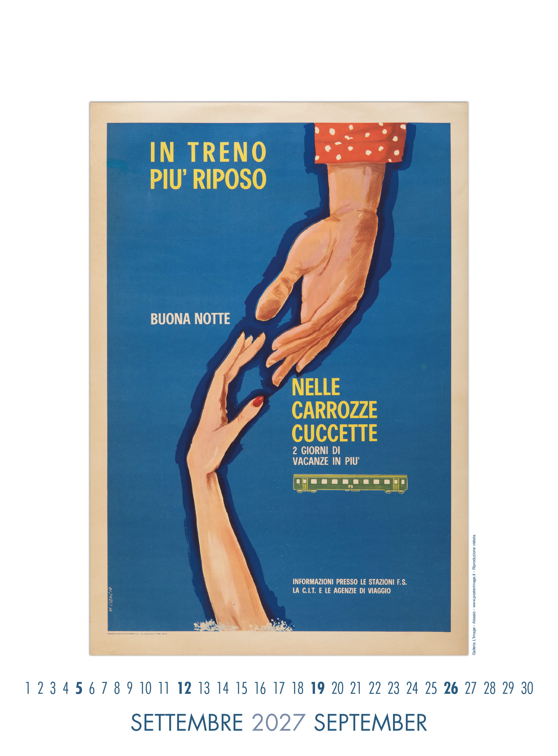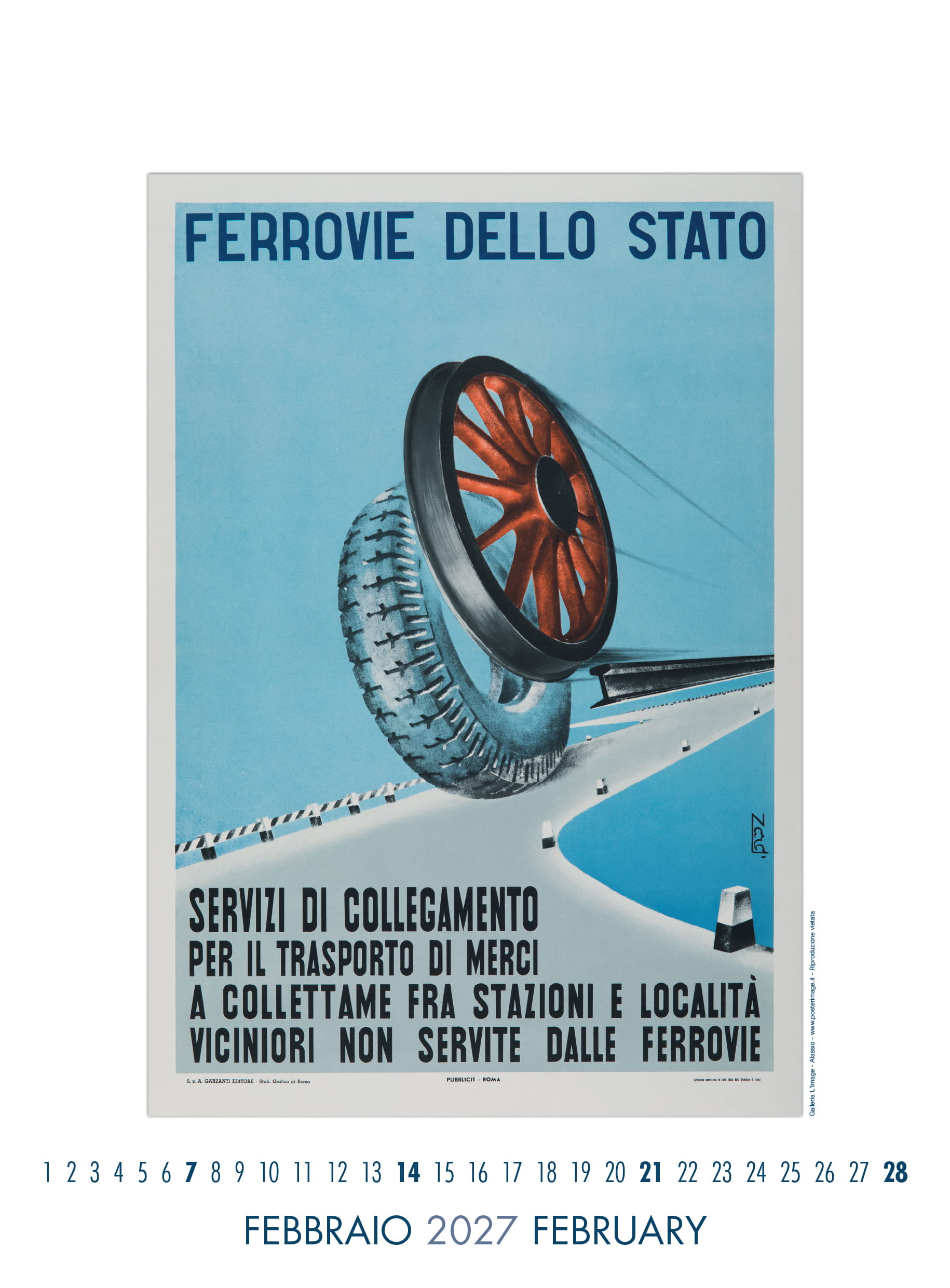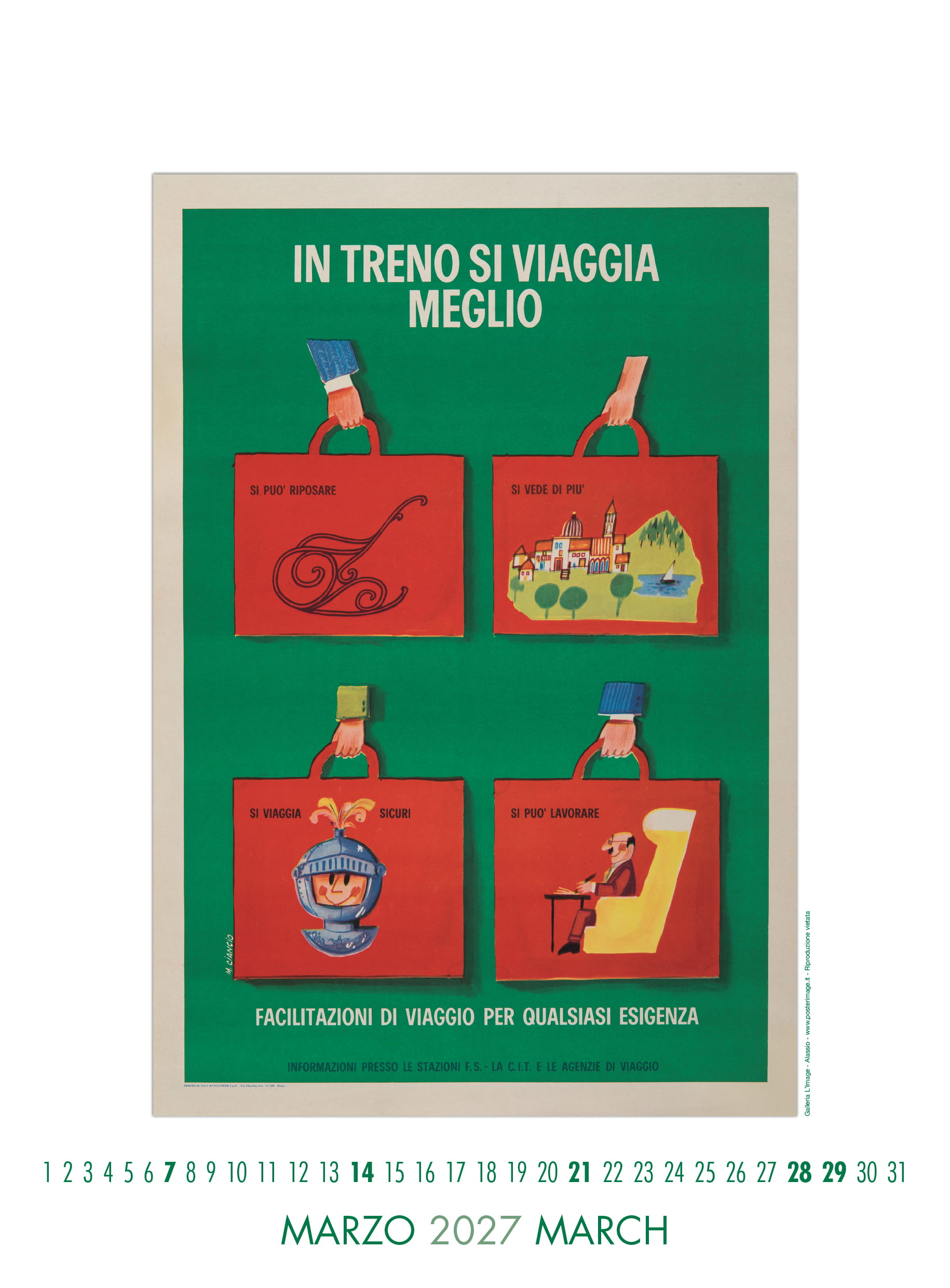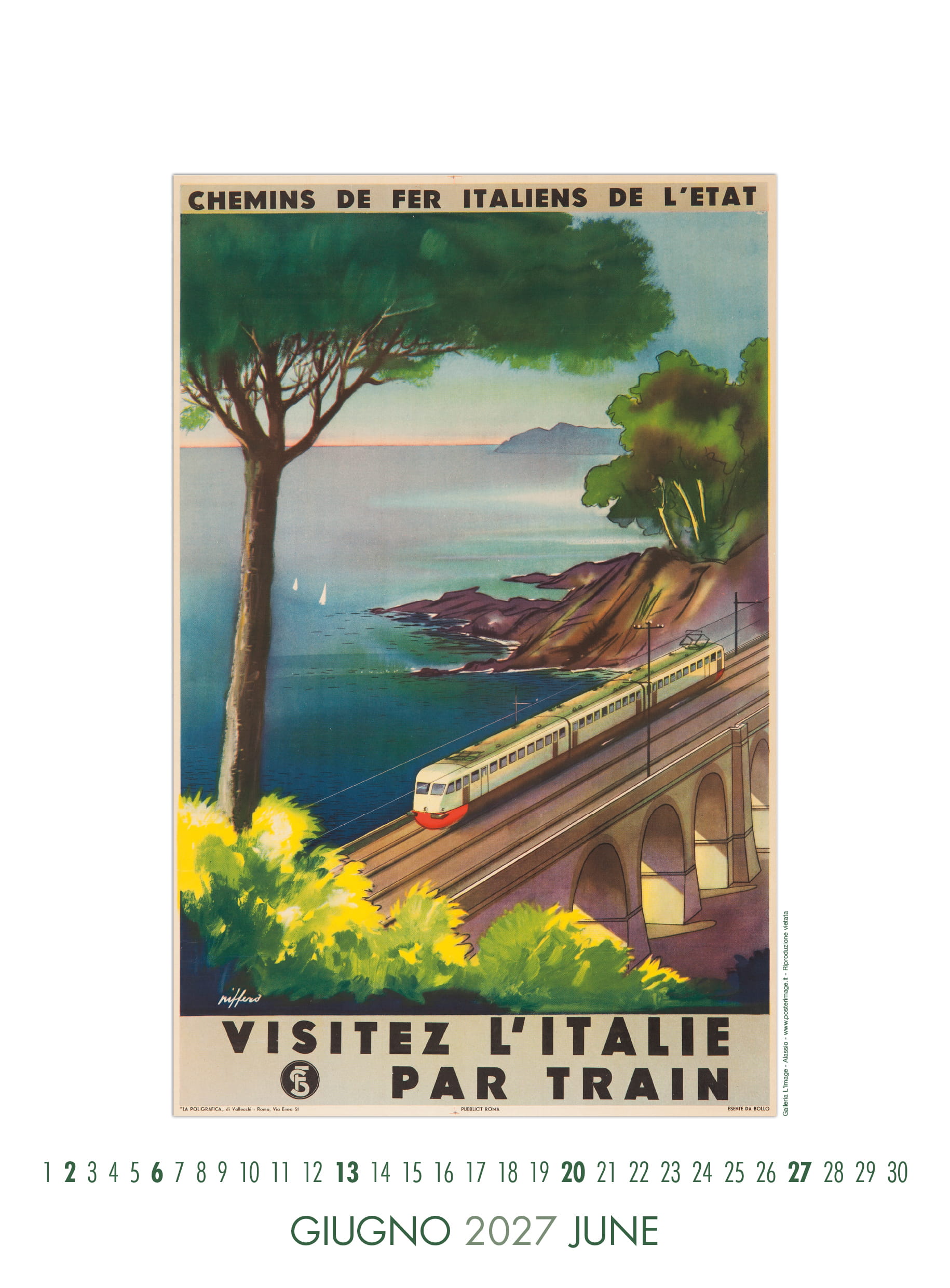 Calendario L’IMAGE 2027 dedicato a 13 manifesti storici delle Ferrovie dello Stato. Un must imperdibile, da regalare, da collezionare, da personalizzare per le aziende. Formato 31 x 42 cm, 14 pagine, carta patinata 250 gr. Prezzo di 30 Euro + 12 Euro per la spedizione in Italia con il corriere (nella stessa tariffa, fino a 2 calendari), pagamento con bonifico bancario, dati su richiesta via e-mail a: info@posterimage.it