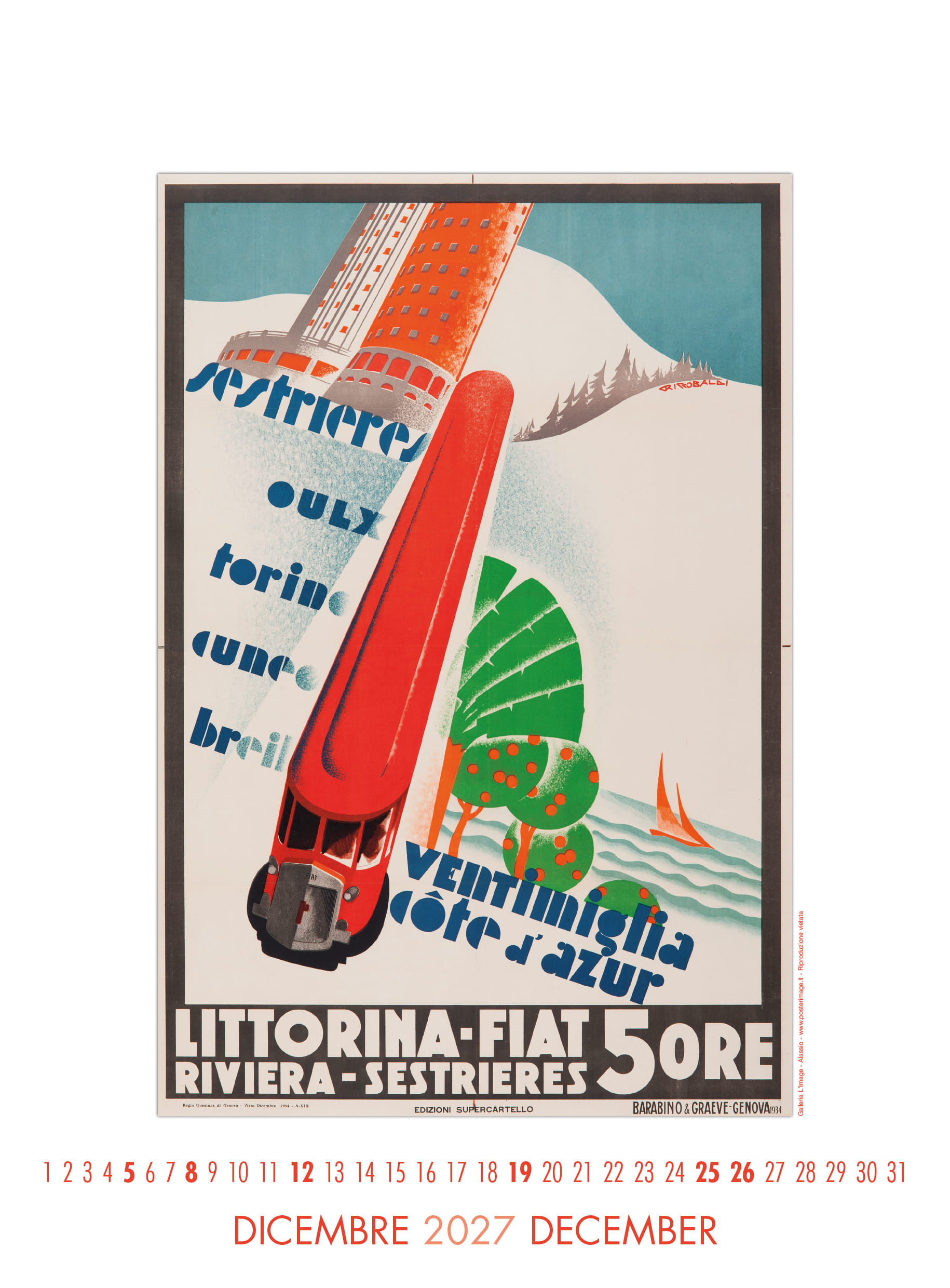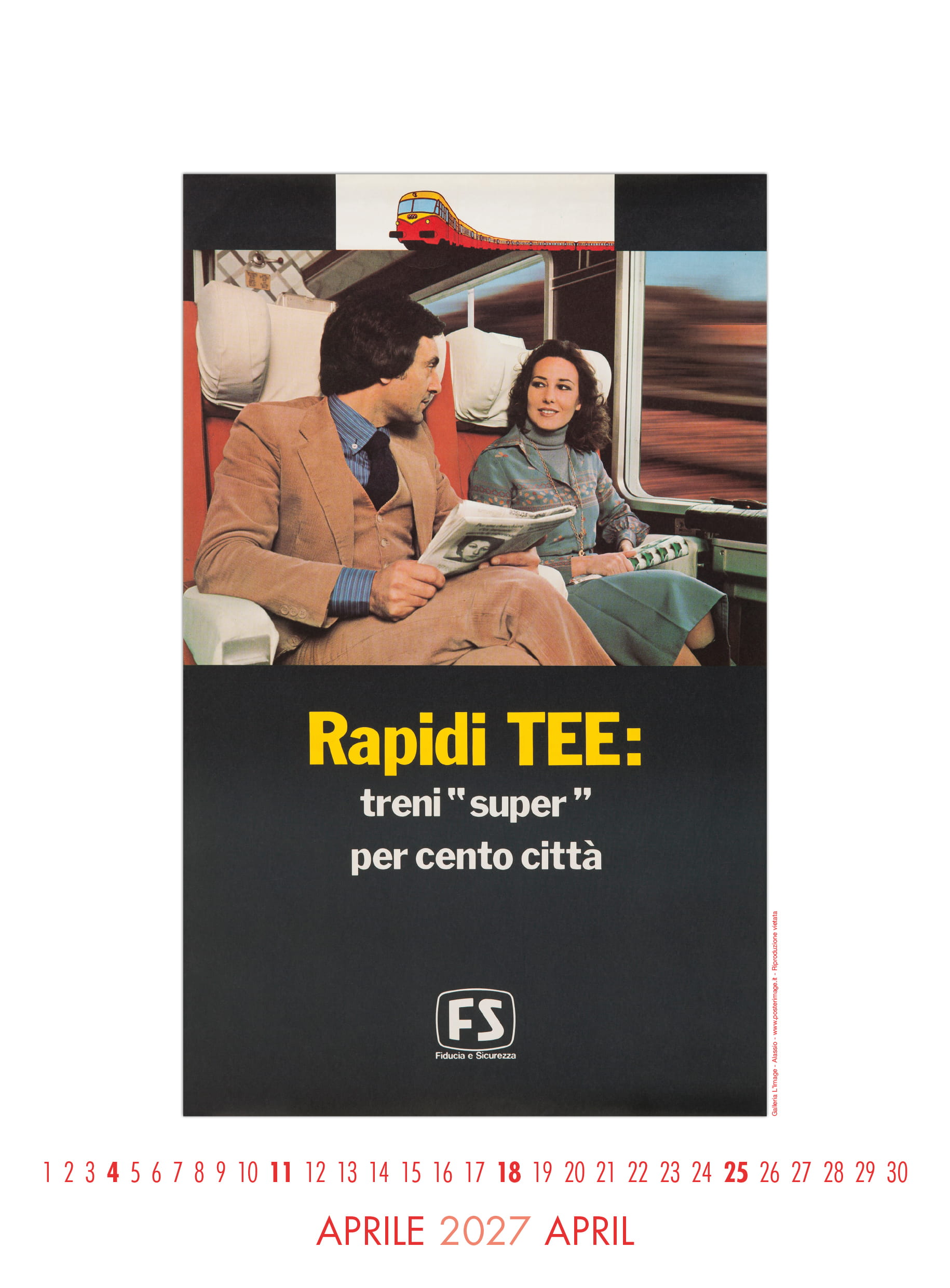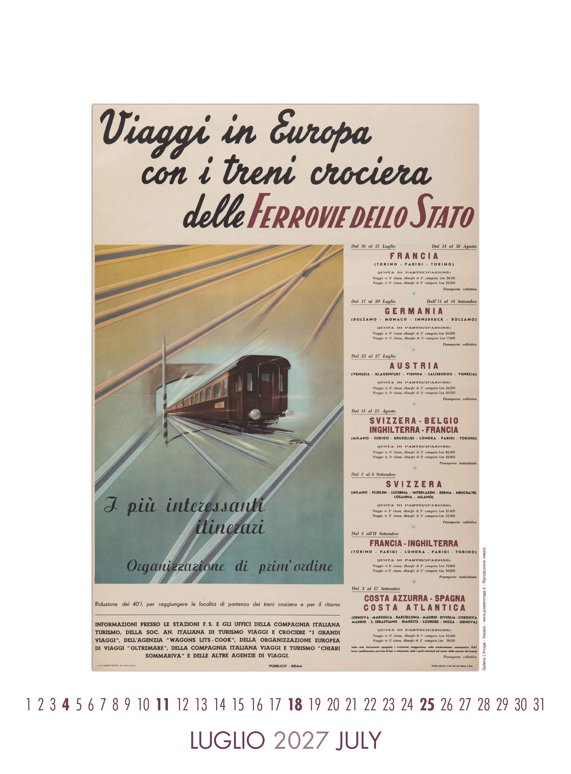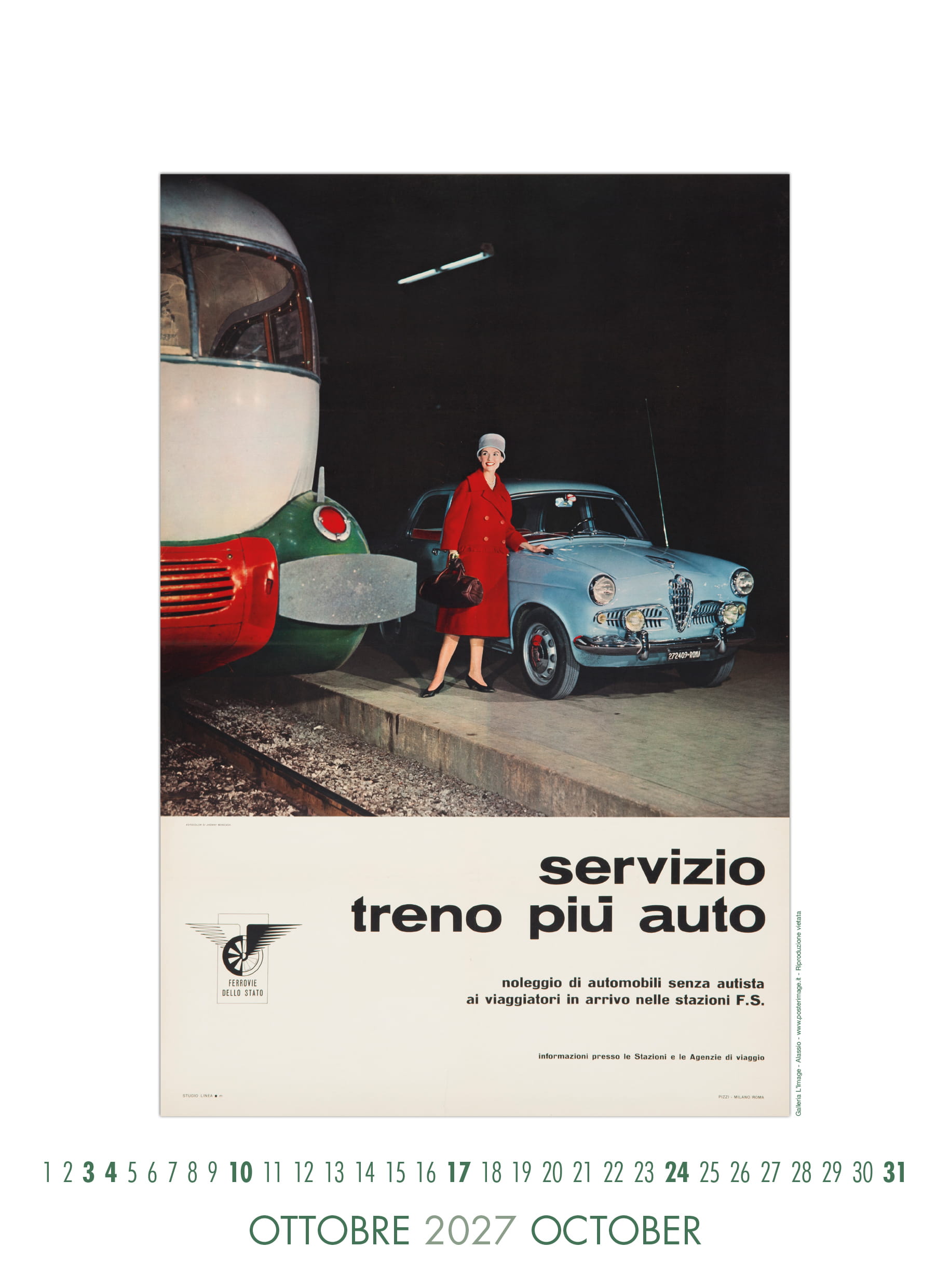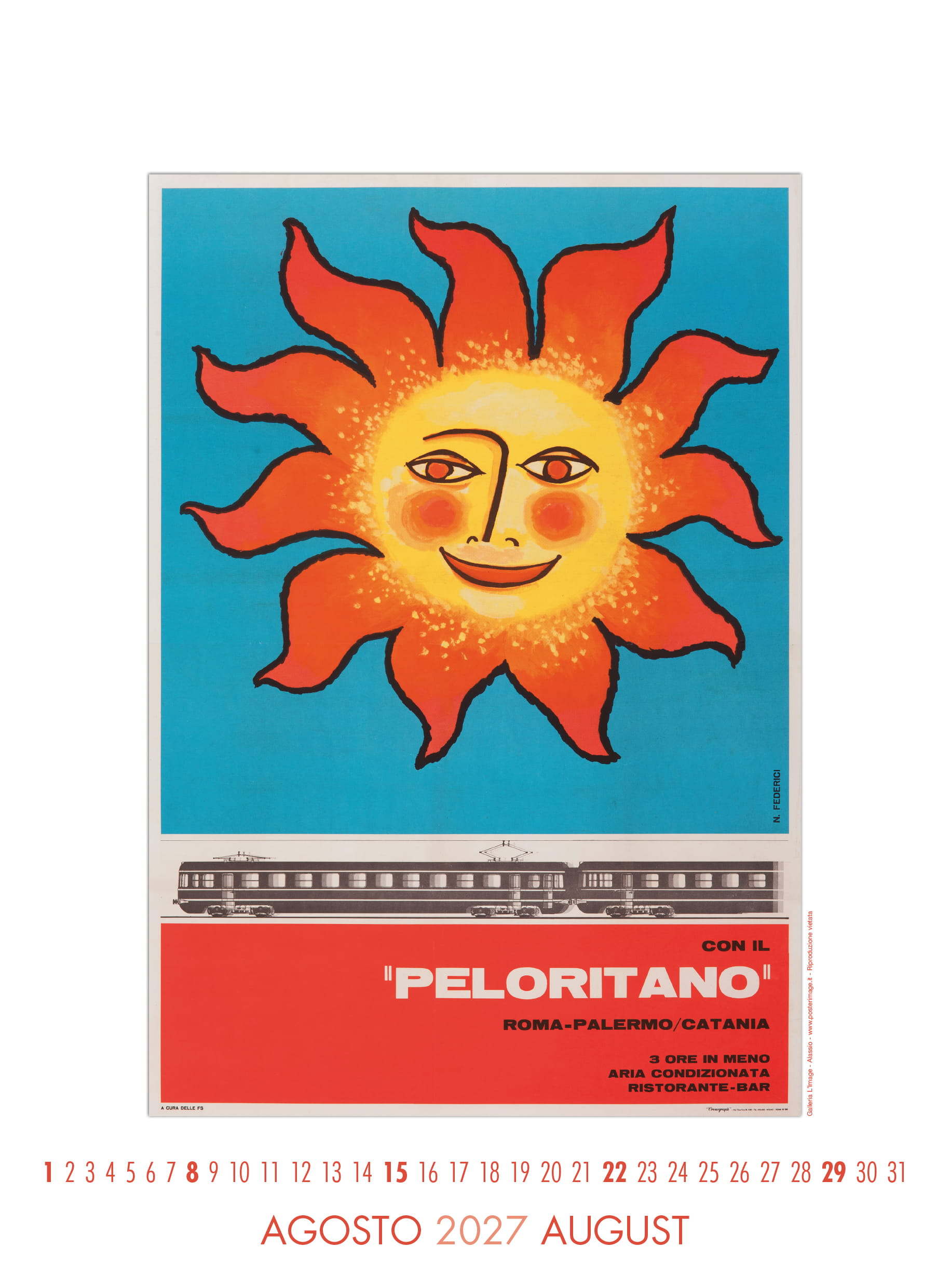 Calendario L’IMAGE 2027 dedicato a 13 manifesti storici delle Ferrovie dello Stato. Un must imperdibile, da regalare, da collezionare, da personalizzare per le aziende. Formato 31 x 42 cm, 14 pagine, carta patinata 250 gr. Prezzo di 30 Euro + 12 Euro per la spedizione in Italia con il corriere (nella stessa tariffa, fino a 2 calendari), pagamento con bonifico bancario, dati su richiesta via e-mail a: info@posterimage.it