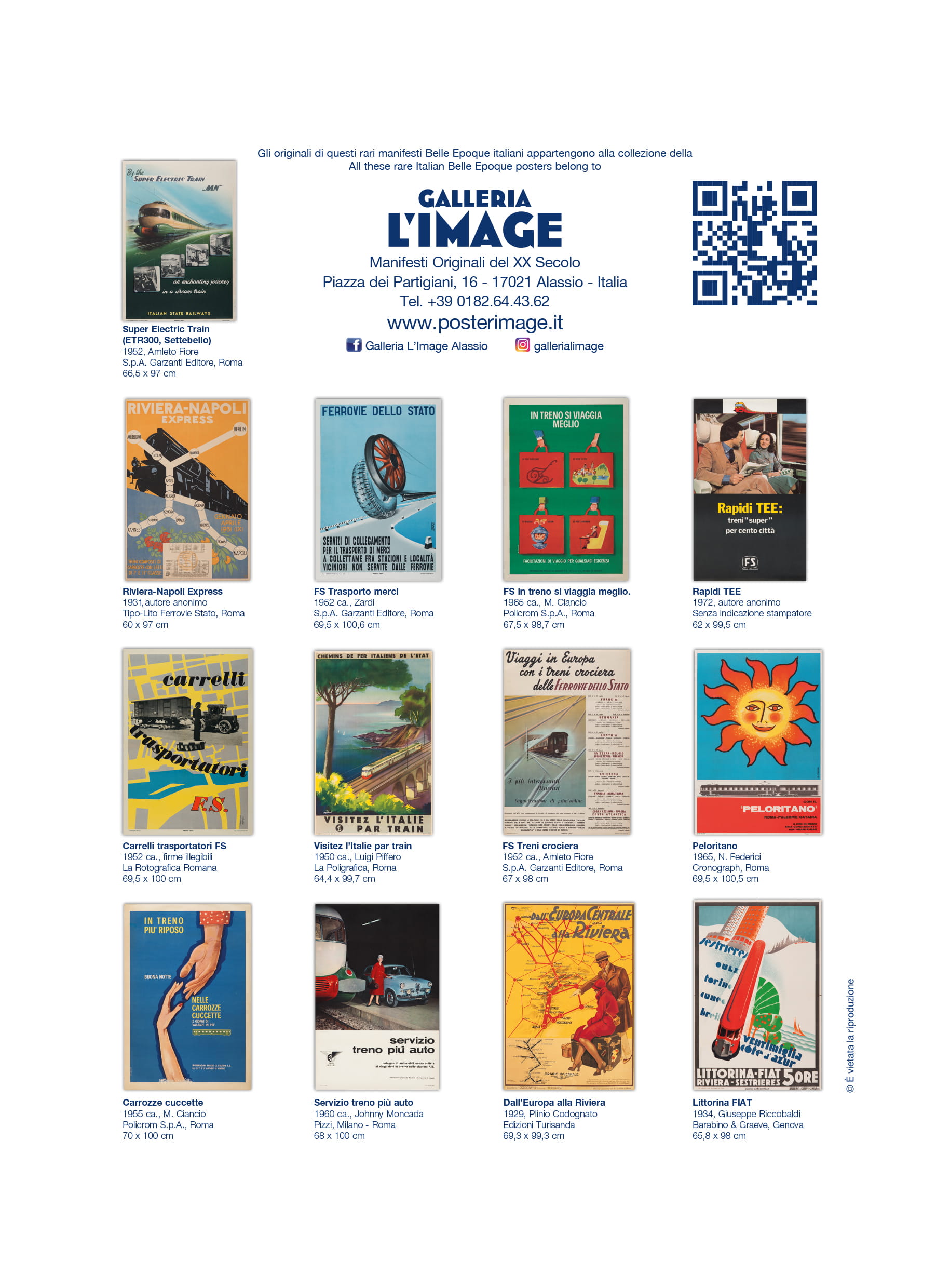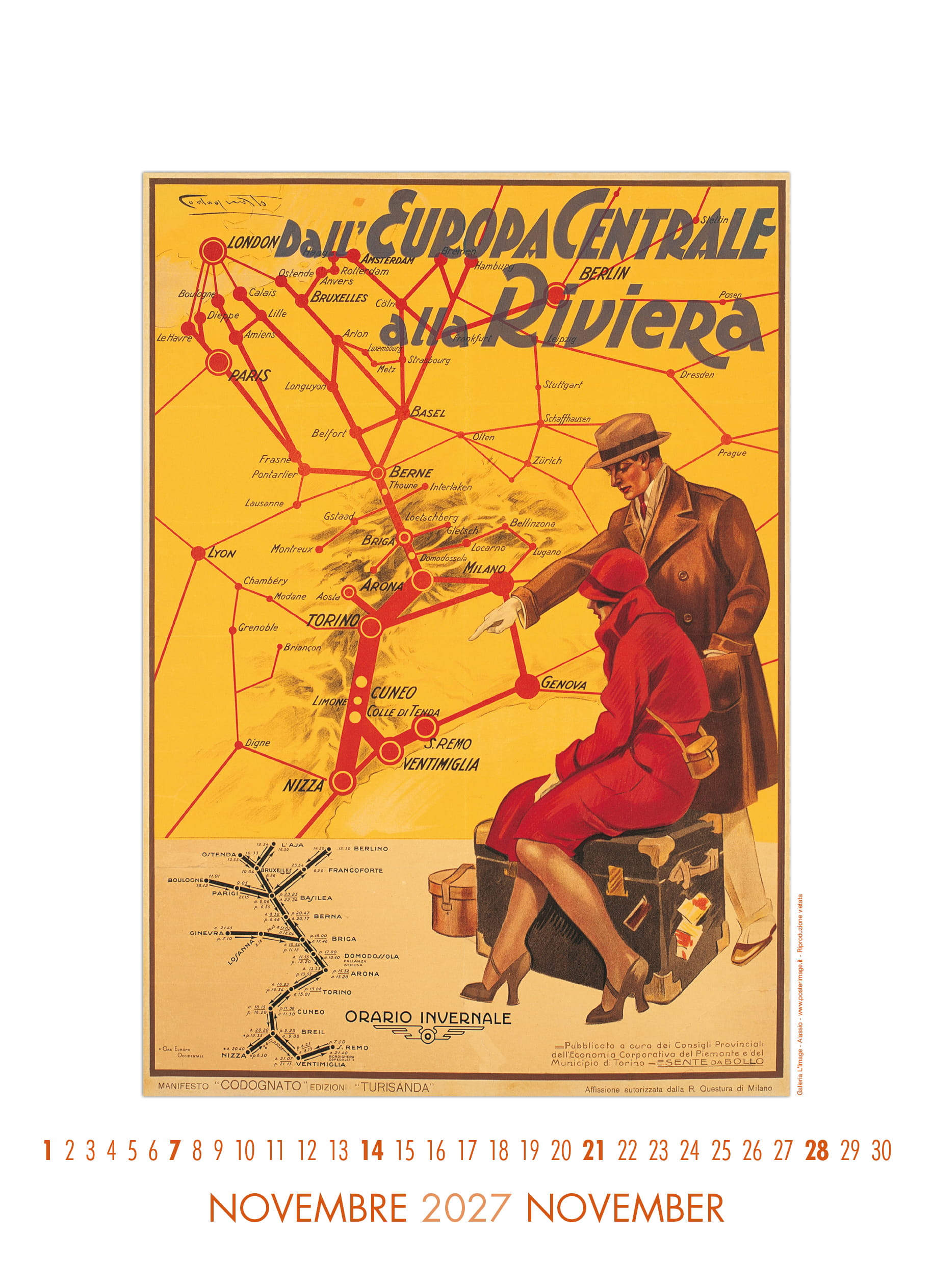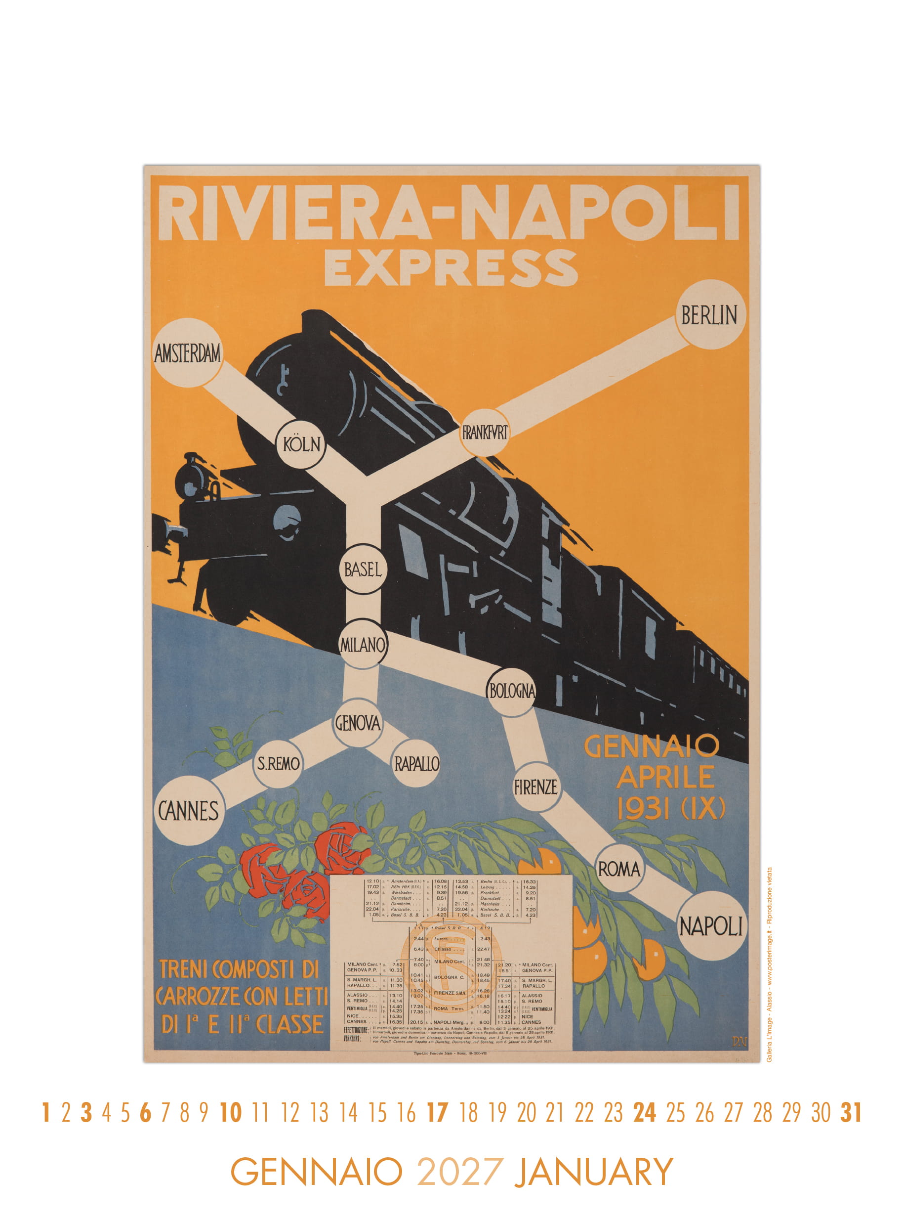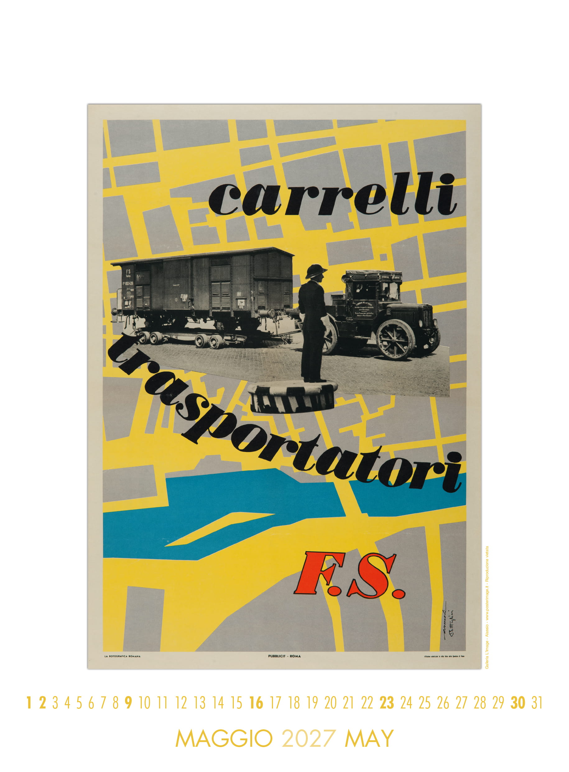 Calendario L’IMAGE 2027 dedicato a 13 manifesti storici delle Ferrovie dello Stato. Un must imperdibile, da regalare, da collezionare, da personalizzare per le aziende. Formato 31 x 42 cm, 14 pagine, carta patinata 250 gr. Prezzo di 30 Euro + 12 Euro per la spedizione in Italia con il corriere (nella stessa tariffa, fino a 2 calendari), pagamento con bonifico bancario, dati su richiesta via e-mail a: info@posterimage.it