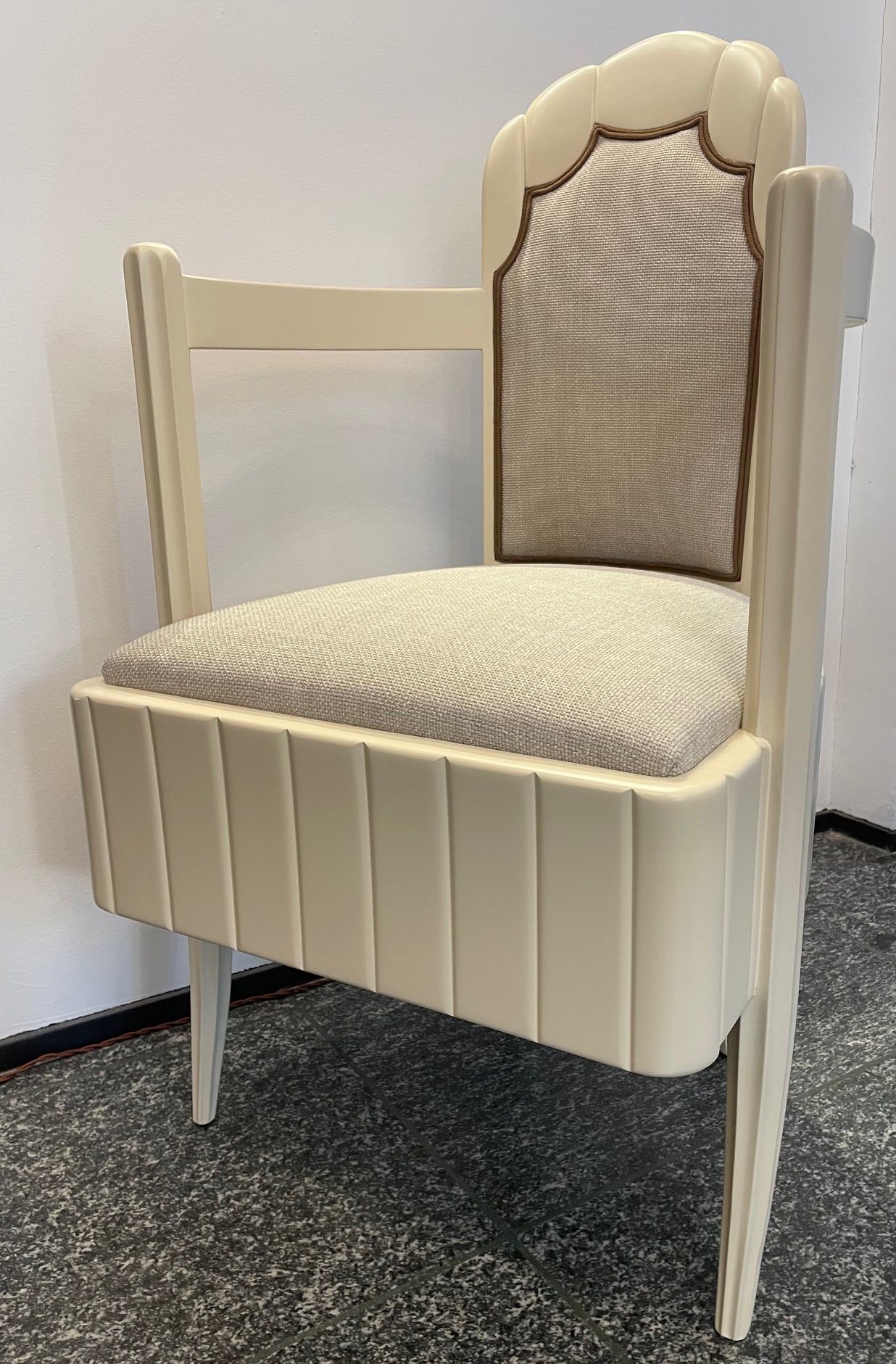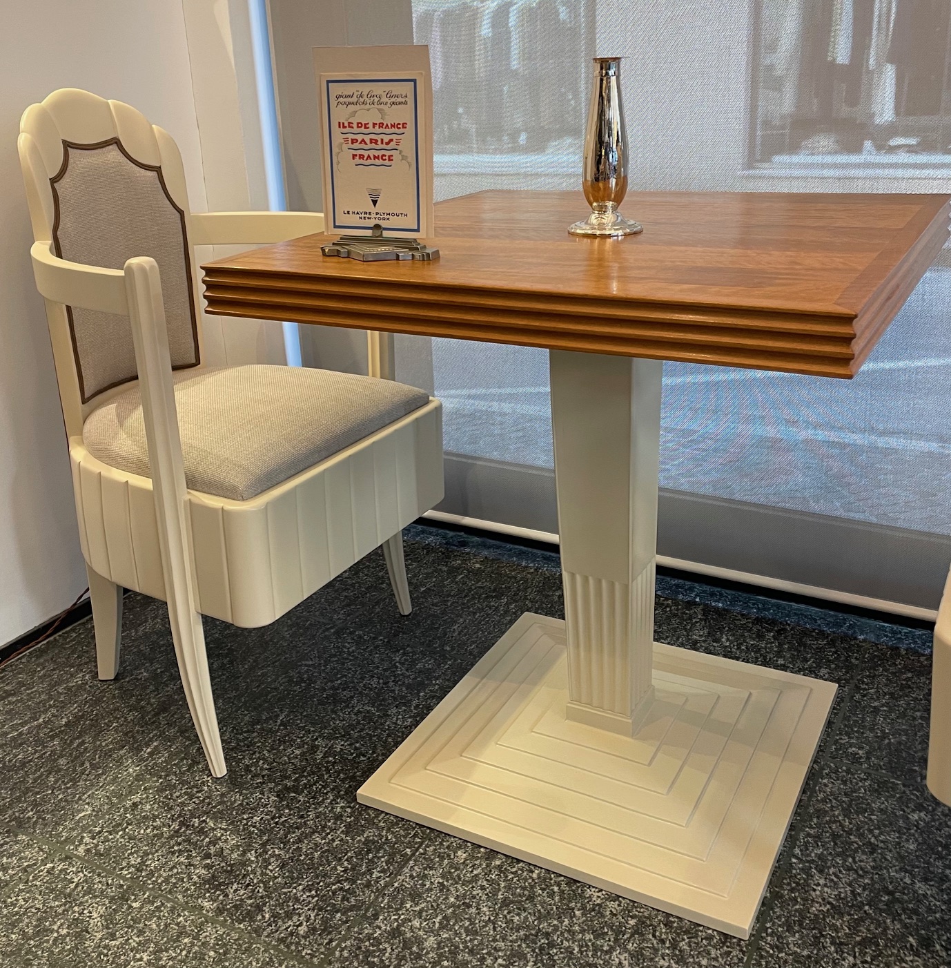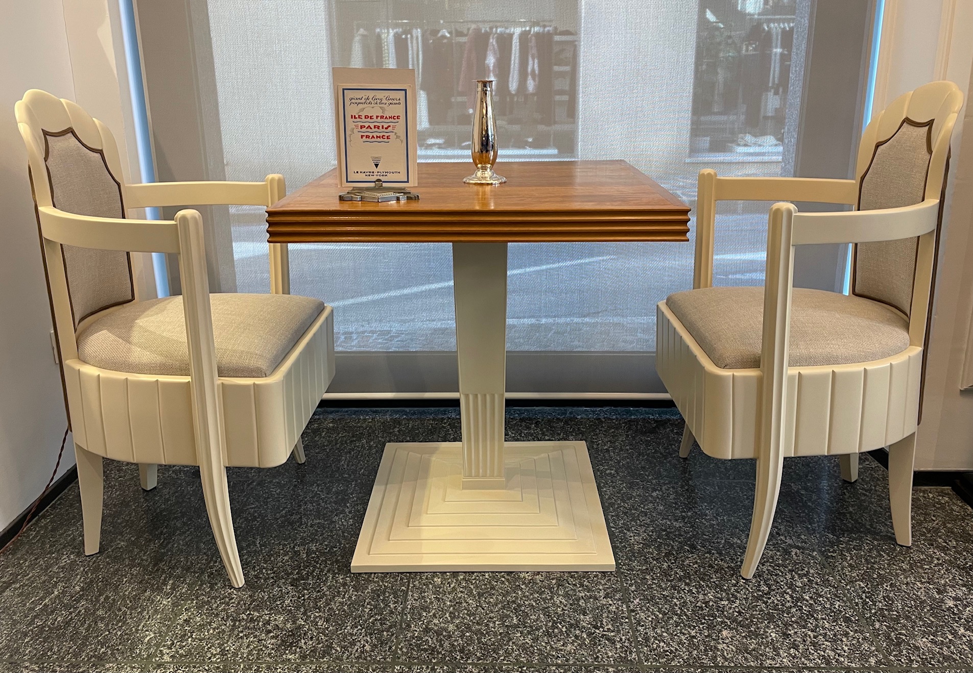 A set of one table and four arm-chairs in sycamore by Pierre Patout for the first class restaurant of the liner ILE DE FRANCE, 1927, CGT Compagnie Générale Transatlantique on the route Le Havre – New York