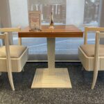 Ensemble di un tavolino e 2 poltroncine in sicomoro di Pierre Patout per il ristorante Prima Classe del transatlantico ILE DE FRANCE, 1927, CGT Compagnie Générale Transatlantique sulla rotta Le Havre – New York